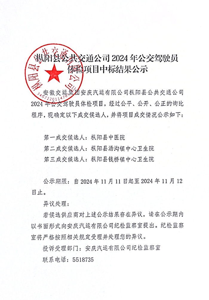 樅陽公交駕駛員2024年體檢項(xiàng)目中標(biāo)公告